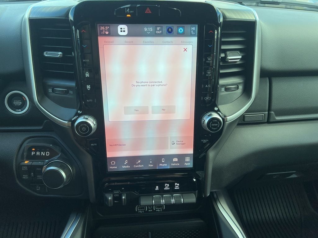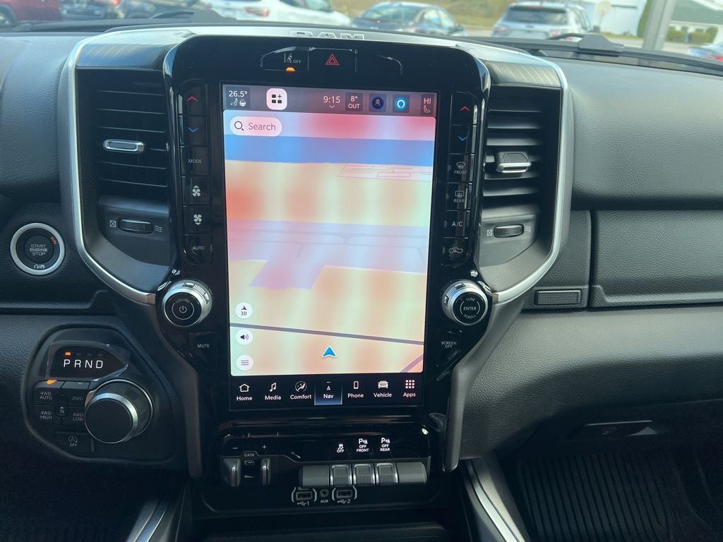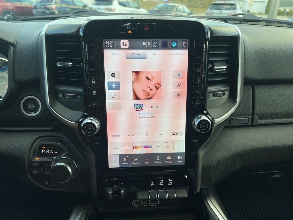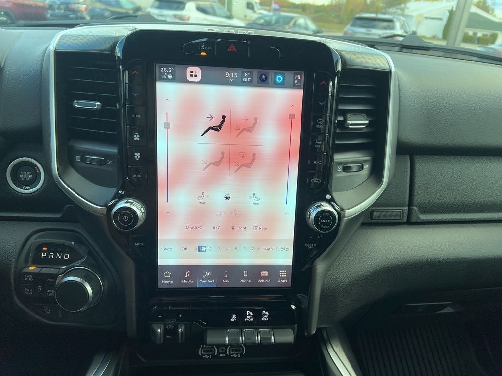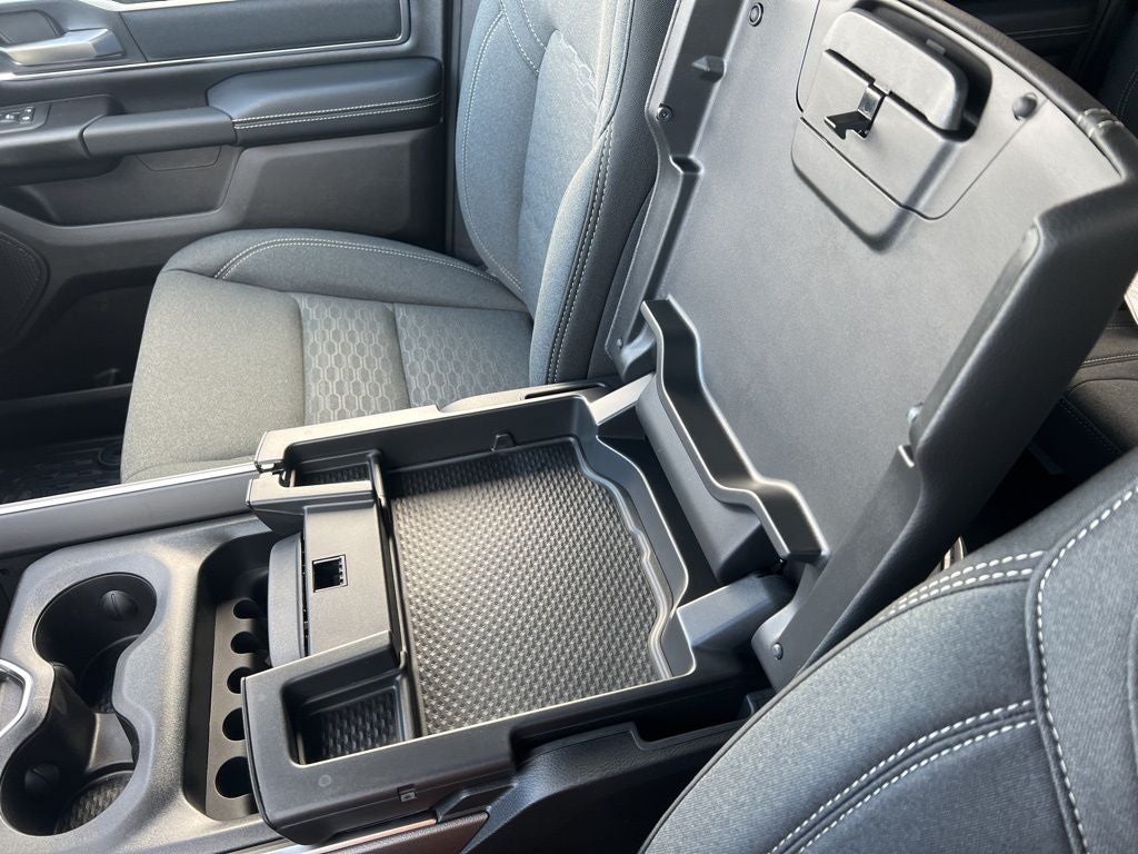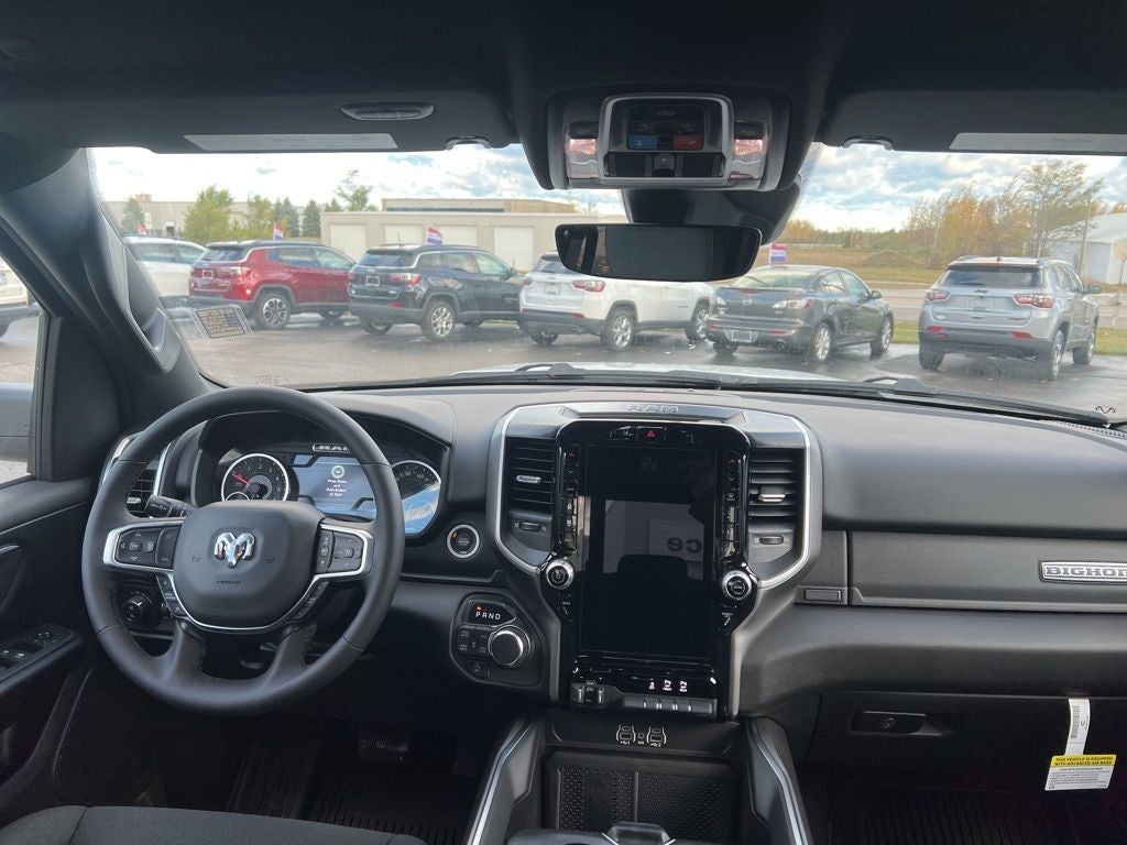 115V Auxiliary Power Outlet, 115V Auxiliary Rear Power Outlet, 12 Touchscreen Display, 3 Rear Seat Head Restraints, 33 Gallon Fuel Tank, 4 Way Front Headrests, 4-Wheel Disc Brakes, 400W Inverter, 48V Belt Starter Generator, 4G LTE Wi-Fi Hot Spot, 6 Speakers, ABS brakes, Air Conditioning, Alloy wheels, AM/FM radio, Anti-Spin Differential Rear Axle, Apple CarPlay, Apple CarPlay/Android Auto, Auto High-beam Headlights, Auto Power-Folding Mirrors, Auto-Dimming Exterior Driver Mirror, Auto-Dimming Rear-View Mirror, Big Horn Level 2 Equipment Group, Black Exterior Mirrors, Black Interior Accents, Black Premium Power Mirrors, Body Color Door Handles, Body Color Fender Flares, Body Color Front Bumper, Body Color Tailgate Handle, Brake assist, Bucket Seats, Bumpers: chrome, Center Console Parts Module, Cloth Bucket Seats, Cluster 7.0 TFT Color Display, Compass, Configurable Drive Mode, Connectivity - US/Canada, Convex Wide-Angle Exterior Mirror Insert, Delay-off headlights, Deluxe Cloth Bucket Seats, Disassociated Touchscreen Display, Driver door bin, Dual front impact airbags, Dual front side impact airbags, Electronic Stability Control, Exterior Mirrors Courtesy Lamps, Front anti-roll bar, Front Bucket Seats, Front Center Armrest w/Storage, Front fog lights, Front reading lights, Front Seat Back Map Pockets, Front wheel independent suspension, Full Length Floor Console, Fully automatic headlights, Glove Box Lamp, Google Android Auto, GPS Antenna Input, GPS Navigation, Grille Surround 1 Body Color Texture 1 Black, HD Radio, Heated door mirrors, Heated Front Seats, Heated Steering Wheel, Illuminated entry, Integrated Center Stack Radio, Leather Wrapped Steering Wheel, LED Footwell Lighting, Low tire pressure warning, Manual Adjust 4-Way Driver Seat, Manual Adjust 4-Way Front Passenger Seat, Manual Folding Exterior Mirrors, Manufacturer's Statement of Origin, Occupant sensing airbag, Outside temperature display, Overhead airbag, Overhead console, Overhead LED Lamps, Panic alarm, ParkView Rear Back-Up Camera, Passenger door bin, Passenger vanity mirror, Power 2-Way Driver Lumbar Adjust, Power Adjust 8-Way Driver Seat, Power Adjustable Pedals, Power door mirrors, Power steering, Power windows, Premium Overhead Console, Quick Order Package 27Z Big Horn, Radio data system, RAM Grille Badge - Chrome, Rear 60/40 Folding Seat, Rear anti-roll bar, Rear Center Armrest, Rear Power Sliding Window, Rear step bumper, Rear Window Defroster, Remote keyless entry, Remote Tailgate Release, Security Alarm, SiriusXM Radio Service, Speed control, Sport Appearance Package, Steering Wheel Mounted Audio Controls, Supplier Part Tracking (J-1), Tachometer, Telescoping steering wheel, Tilt steering wheel, Traction control, Trailer Brake Control, Trip computer, Universal Garage Door Opener, USB Host Flip, Variably intermittent wipers, Voltmeter, Wheels: 18 x 8 Cast-Aluminum Painted, Wheels: 20 x 9 Aluminum Chrome Clad.