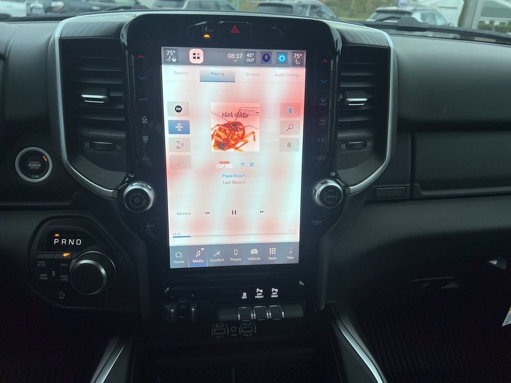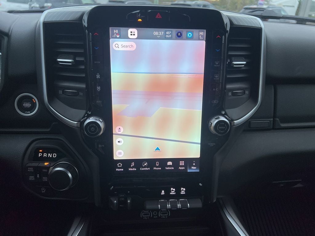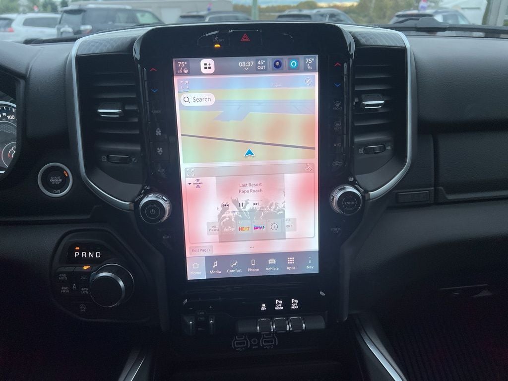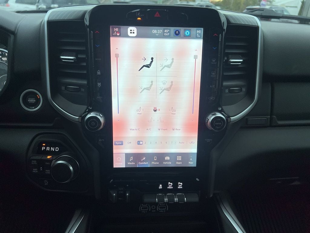 115V Auxiliary Power Outlet, 115V Auxiliary Rear Power Outlet, 12 Touchscreen Display, 3 Rear Seat Head Restraints, 33 Gallon Fuel Tank, 4 Way Front Headrests, 4-Wheel Disc Brakes, 400W Inverter, 48V Belt Starter Generator, 4G LTE Wi-Fi Hot Spot, 6 Speakers, ABS brakes, Air Conditioning, Alloy wheels, AM/FM radio, Anti-Spin Differential Rear Axle, Apple CarPlay, Apple CarPlay/Android Auto, Auto High-beam Headlights, Auto Power-Folding Mirrors, Auto-Dimming Exterior Driver Mirror, Auto-Dimming Rear-View Mirror, Big Horn Level 2 Equipment Group, Black Exterior Mirrors, Black Interior Accents, Black Premium Power Mirrors, Body Color Door Handles, Body Color Fender Flares, Body Color Front Bumper, Body Color Tailgate Handle, Brake assist, Bucket Seats, Bumpers: chrome, Center Console Parts Module, Cloth Bucket Seats, Cluster 7.0 TFT Color Display, Compass, Configurable Drive Mode, Connectivity - US/Canada, Convex Wide-Angle Exterior Mirror Insert, Delay-off headlights, Deluxe Cloth Bucket Seats, Disassociated Touchscreen Display, Driver door bin, Dual front impact airbags, Dual front side impact airbags, Electronic Stability Control, Exterior Mirrors Courtesy Lamps, Front anti-roll bar, Front Bucket Seats, Front Center Armrest w/Storage, Front fog lights, Front reading lights, Front Seat Back Map Pockets, Front wheel independent suspension, Full Length Floor Console, Fully automatic headlights, Glove Box Lamp, Google Android Auto, GPS Antenna Input, GPS Navigation, Grille Surround 1 Body Color Texture 1 Black, HD Radio, Heated door mirrors, Heated Front Seats, Heated Steering Wheel, Illuminated entry, Integrated Center Stack Radio, Leather Wrapped Steering Wheel, LED Footwell Lighting, Low tire pressure warning, Manual Adjust 4-Way Driver Seat, Manual Adjust 4-Way Front Passenger Seat, Manual Folding Exterior Mirrors, Manufacturer's Statement of Origin, Occupant sensing airbag, Outside temperature display, Overhead airbag, Overhead console, Overhead LED Lamps, Panic alarm, ParkView Rear Back-Up Camera, Passenger door bin, Passenger vanity mirror, Power 2-Way Driver Lumbar Adjust, Power Adjust 8-Way Driver Seat, Power Adjustable Pedals, Power door mirrors, Power steering, Power windows, Premium Overhead Console, Quick Order Package 27Z Big Horn, Radio data system, RAM Grille Badge - Chrome, Rear 60/40 Folding Seat, Rear anti-roll bar, Rear Center Armrest, Rear Power Sliding Window, Rear step bumper, Rear Window Defroster, Remote keyless entry, Remote Tailgate Release, Security Alarm, SiriusXM Radio Service, Speed control, Sport Appearance Package, Steering Wheel Mounted Audio Controls, Supplier Part Tracking (J-1), Tachometer, Telescoping steering wheel, Tilt steering wheel, Traction control, Trailer Brake Control, Trip computer, Universal Garage Door Opener, USB Host Flip, Variably intermittent wipers, Voltmeter, Wheels: 18 x 8 Cast-Aluminum Painted, Wheels: 20 x 9 Aluminum Chrome Clad.